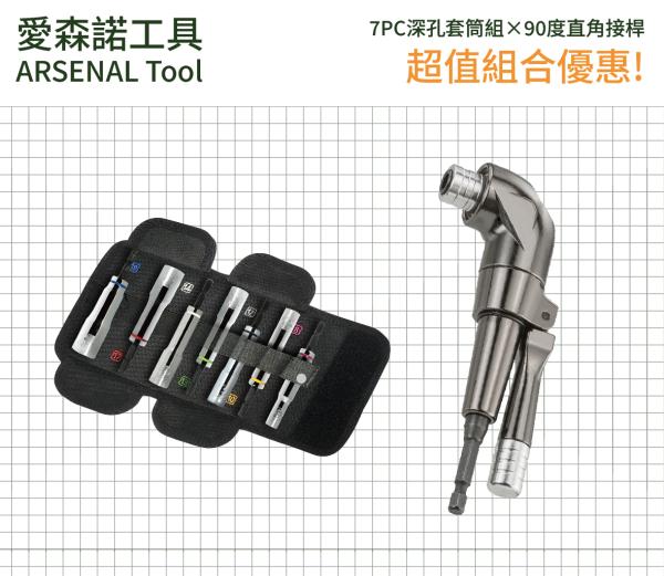 愛森諾|7PC深孔套筒組 + 90度直角接桿 超值組合
