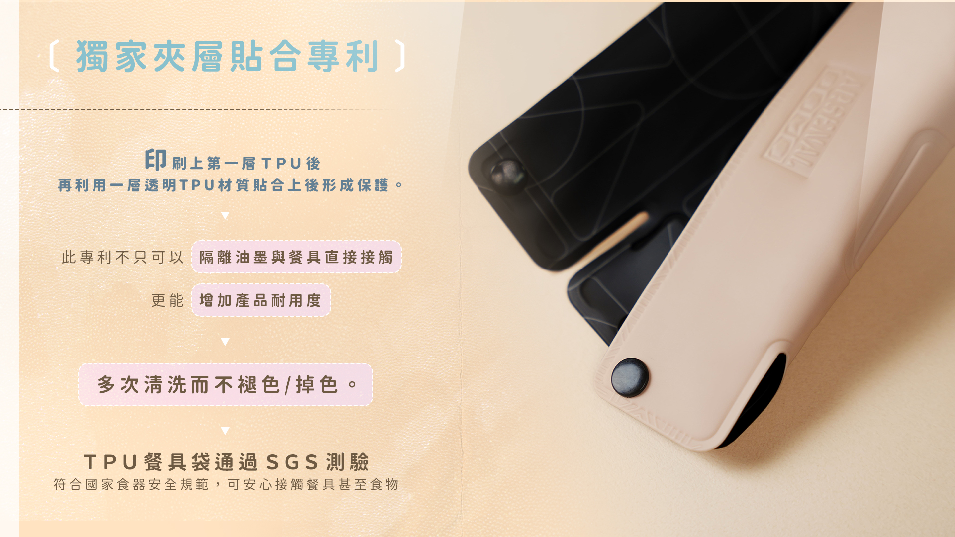 專利複合結構保護/隔絕圖案印刷,達到食品容器安全,材質手感佳,耐清洗不易掉色優點。
