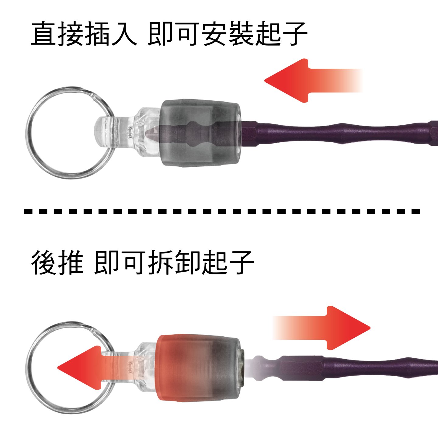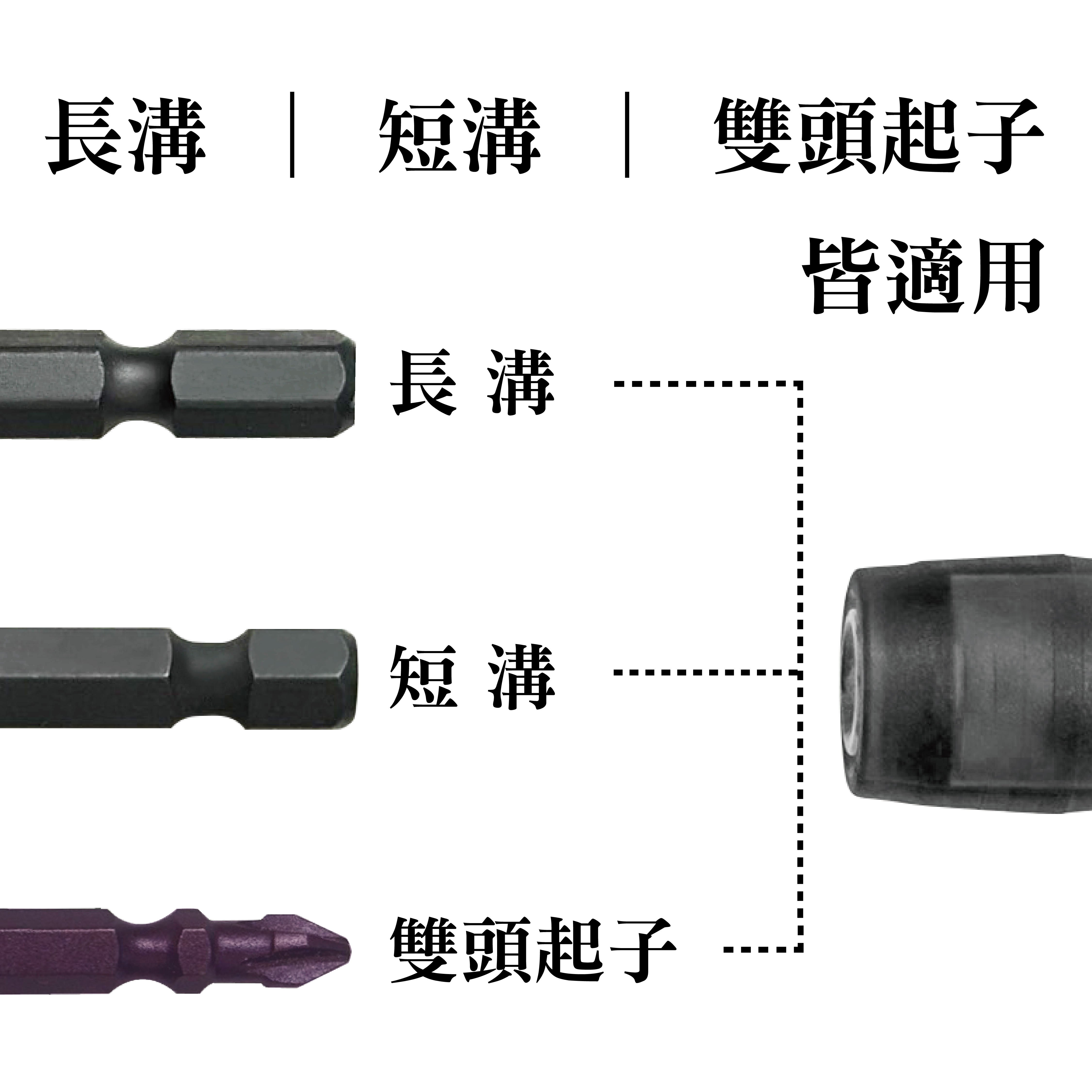 快插收納、後推拆卸配件;可通用長短溝、兩分雙頭起子。